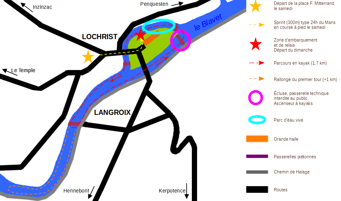 Le site de la manifestation est unique en son genre. Au cœur d’une vallée verdoyante exceptionnellement préservée, où cheminent parfois des péniches, la rivière du Blavet se sépare en deux bras, formant l’Île de Locastel. D’un côté, l’ascenseur à kayaks permet de passer l’écluse tandis que de l’autre côté, une glissière mène au parc d’eau vive, qui offre un terrain de jeu idéal aux kayakistes. La boucle autour de l’île constitue donc un parcours tout naturel.